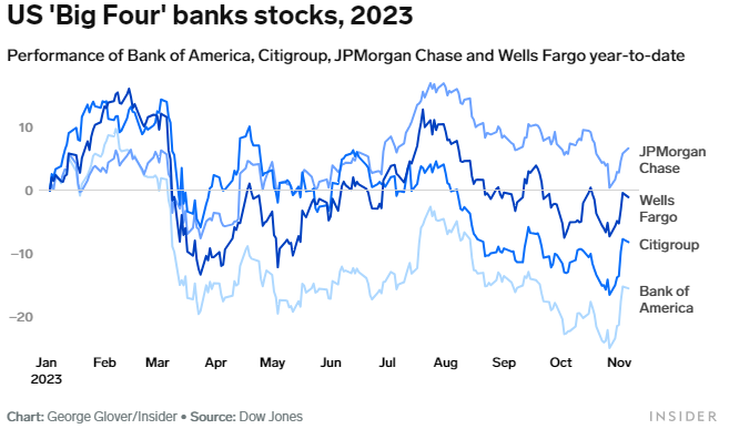 今年就出现了这种情况,四大银行中有三家的股票下跌。可以预见的是,美国银行受到的影响最为严重,其股价去年下跌了24%,今年迄今下跌了14%。