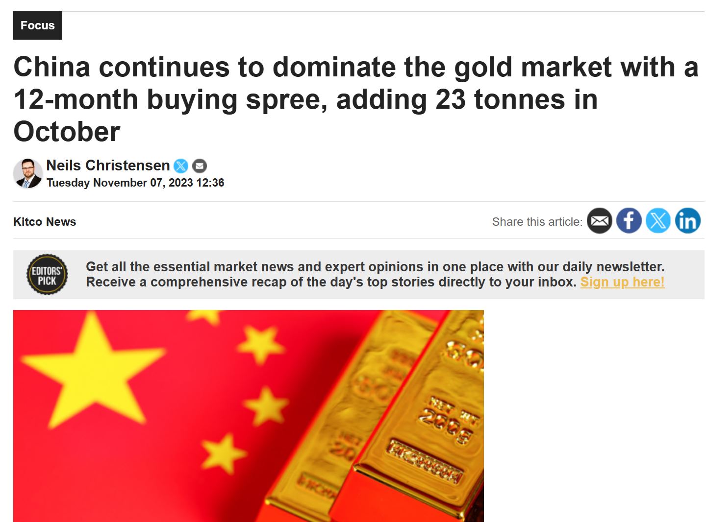 世界黄金协会分析师Krishan Gopaul在社交媒体上援引中国人民银行的最新数据报道称,中国在10月份又购买了23吨黄金。这是中国连续第12个月购买黄金。“据报道,现在的黄金储备总量为2,215吨,比年初高出204吨,”Gopaul在评论中说。