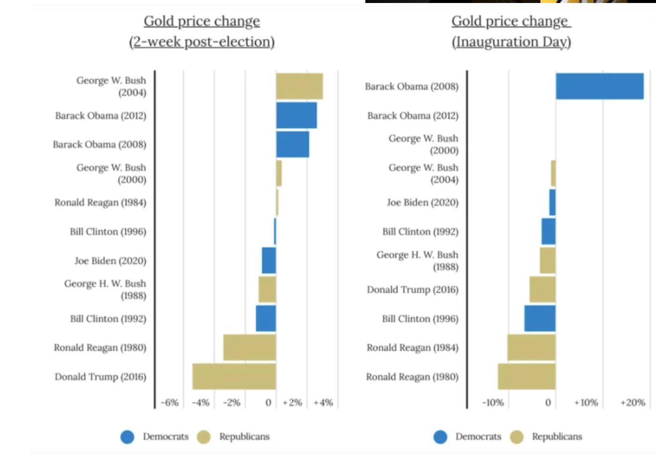 该文章援引政府发行贵金属的主要分销商——美国货币储备局进行的一项研究,该研究发现自1980年以来,民主党的胜利导致金价在总统大选后的两周内平均上涨了0.5%,共和党获胜的同一时期平均价格下跌了1.1%。