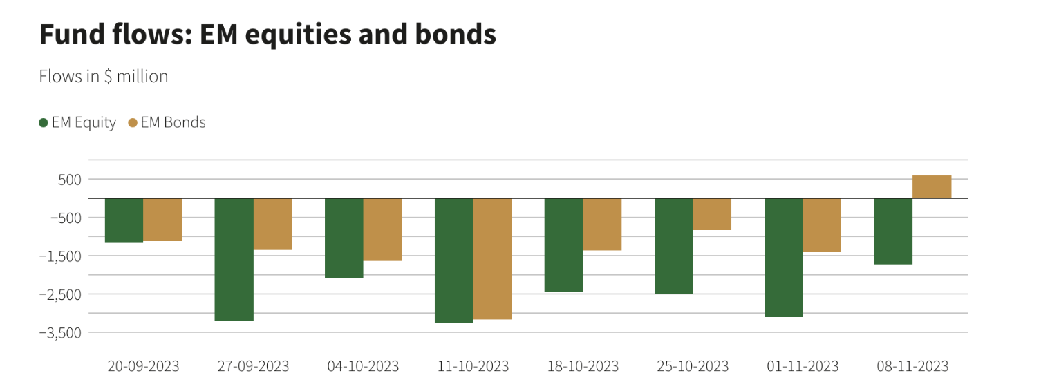涵盖 29,633 只基金的新兴市场数据显示,新兴市场股票基金净抛售 17.3 亿美元,延续了 13 周的撤资趋势。
