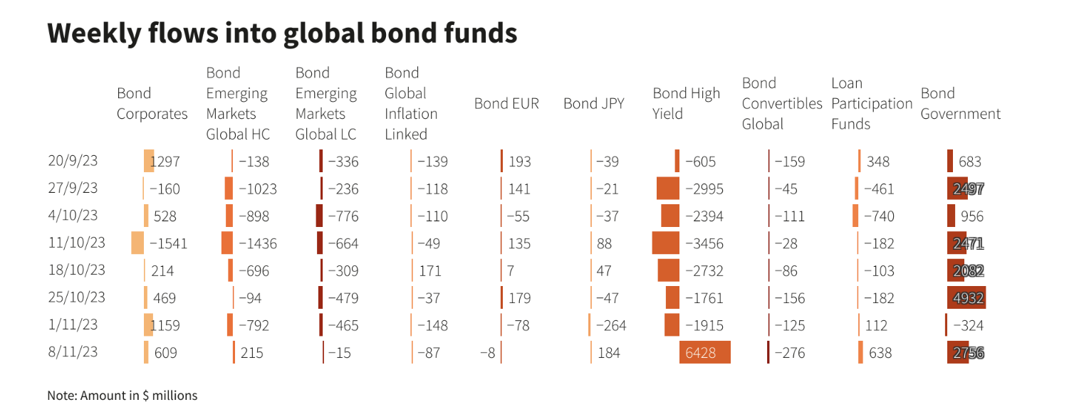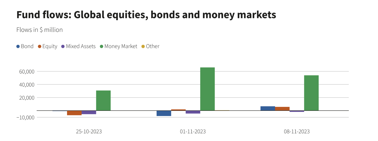 2023-11-10 19:15:34截至11月8日当周,全球股票基金的需求大幅上升,主要央行决定维持政策利率不变,投资者情绪有所改善。