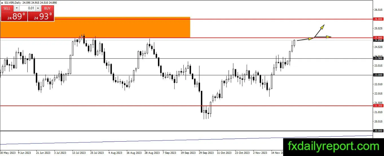 白银价格继续上涨,很快达到25.00美元至26.00美元区域。这种看涨走势似乎将持续下去,交易者应避免空头头寸。当价格收盘高于26.00美元时,就确认了长期看涨趋势的延续。如果价格出现看跌修正,那么交易者可以利用这个机会建立多头头寸。