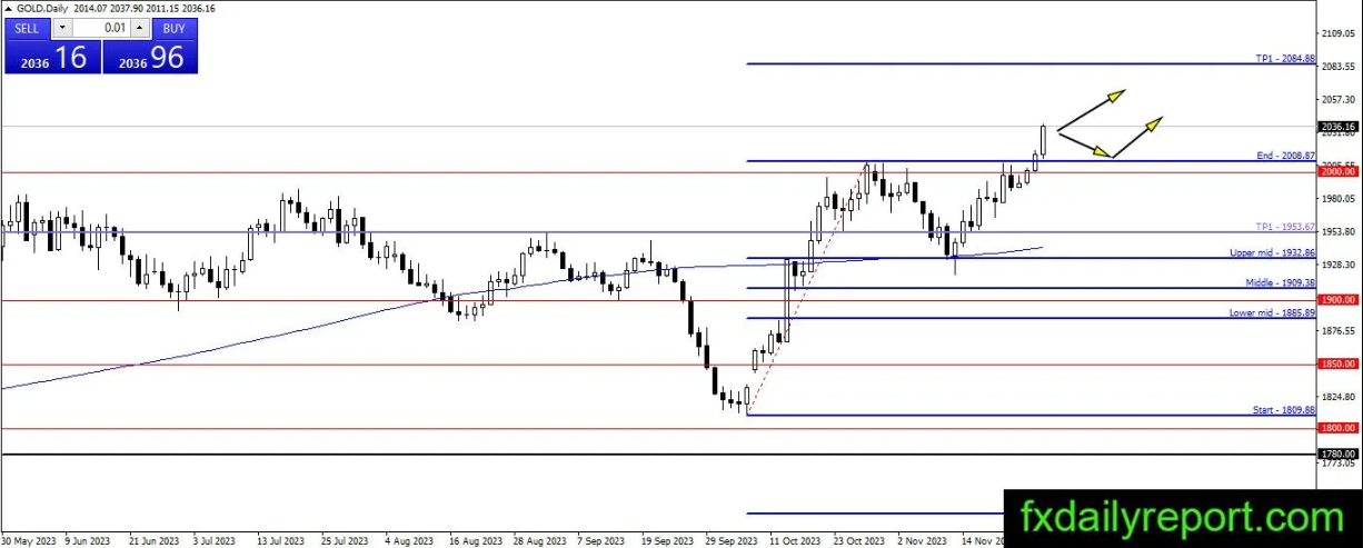 金价突破2,000美元大关,目前将继续其看涨趋势。当然,历史高点将是最近的上涨目标。随后,交易者可以使用斐波那契扩展工具,将目标定为当前上升趋势的点,即2084.88美元。由于美元指数持续下跌,目前没有理由对金价持悲观态度。