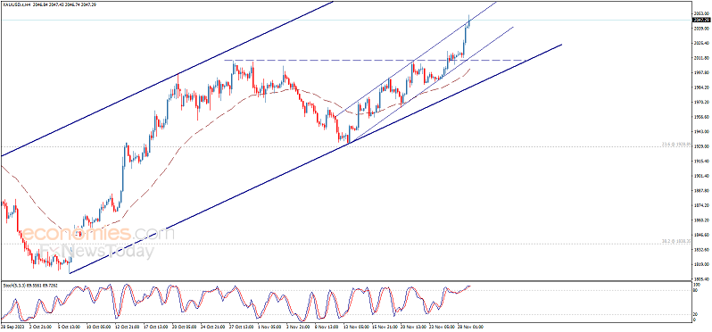 50周期指数移动平均线(EMA)继续支持金价处于看涨走势。需要考虑到的是,若金价未能突破上述阻力(在2047.00美元/盎司附近),这将推动金价回落并跌向关键支撑2009.30美元/盎司,然后重新尝试反弹。