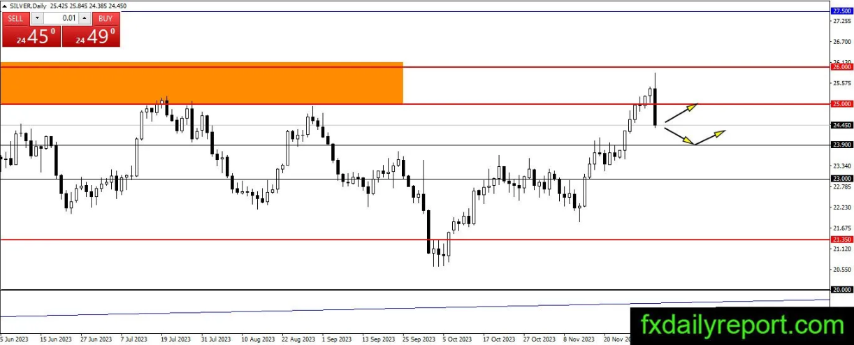 白银价格盘中一度上涨并达到26.00美元附近,随后则出现了非常强烈的看跌反应,目前价格跌破25.00美元点。如果这种看跌压力持续下去,那么23.00美元至23.90美元区域可能会成为值得关注的下行目标,作为建立多头头寸的地方。