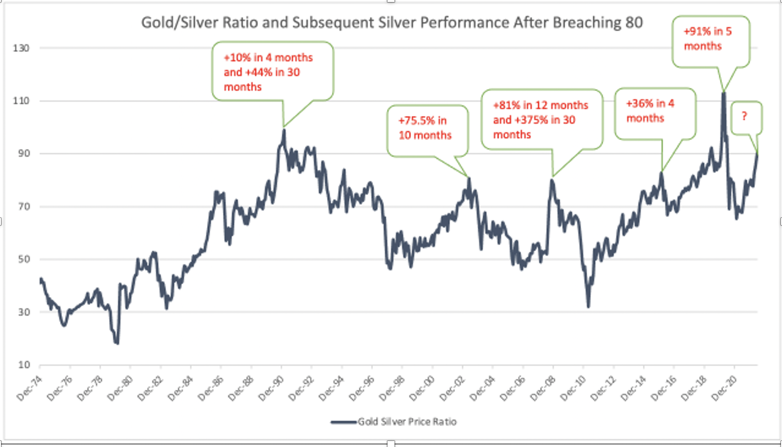 当价差达到如此之大时,白银不仅表现优于黄金,而且会在短时间内大幅上涨。自2000年1月以来,这种情况已经发生了4次。正如该图所示,反弹迅速而强劲。