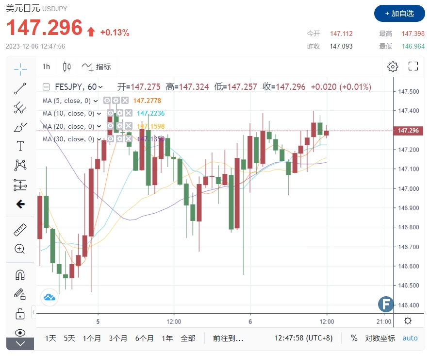 2023-12-06 13:58:48周三(12月6日)欧市盘前,美元/日元继续在147.20附近窄幅震荡,未能真正回到148上方重掌多头方向盘。日本央行副行长Ryozo Himino的讲话“鸽中带鹰”,尽管重申了继续实施货币宽松的标准承诺,但却暗示负利率政策将结束,意味着汇市“黑天鹅”事件很可能提前上演。