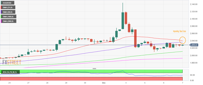 2023-12-07 18:27:51周四(12月7日)欧市盘中,现货黄金维持日内反弹走势,金价目前交投在2034美元/盎司附近。FXStreet分析师Dhwani Mehta最新撰文,对金价技术前景进行分析。