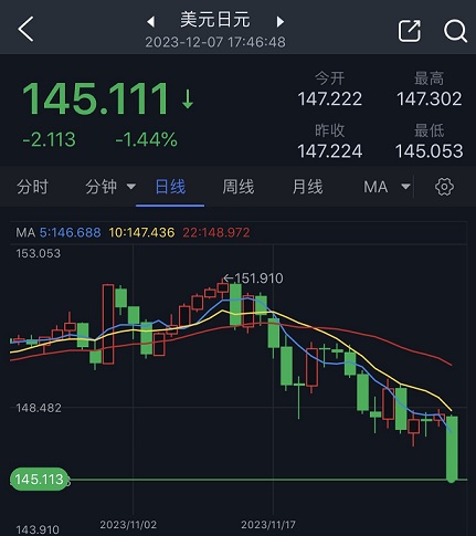 2023-12-07 18:26:45周四(12月7日)欧市盘中,美元/日元延续大跌跌势,目前跌至145.10附近,日内暴跌逾200点。围绕日本央行加息的押注急速升温,这刺激日元飙升。