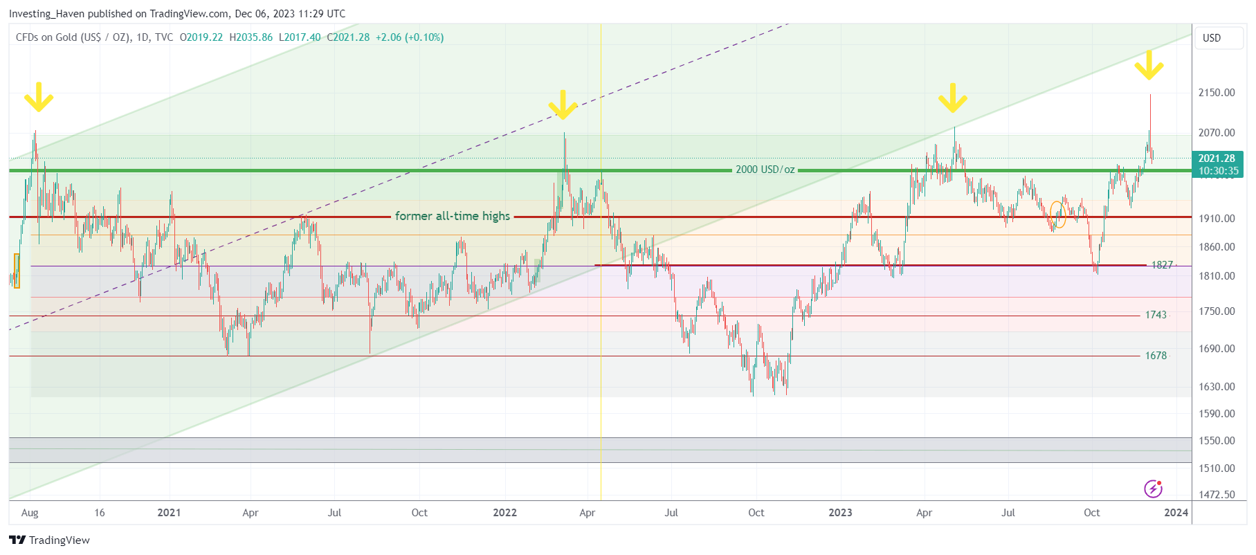 另一方面,如果金价在2023年12月12日之前快速走低,则可能意味着更强劲的回调开始,这将导致金价跌破2000美元/盎司。