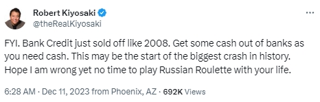 2023-12-11 11:38:20《富爸爸穷爸爸》作者罗伯特·清崎(Robert Kiyosaki)在周一(12月11日)写道,市场正在重演2008年次贷危机,这可能是历史上最大崩盘的开始,他呼吁投资者应该尽快从银行取出现金。他也提出时间线称,大萧条从1929年到1954年持续25年,市场需思考需要多长时间,人们才能摆脱2020年进入的大萧条。