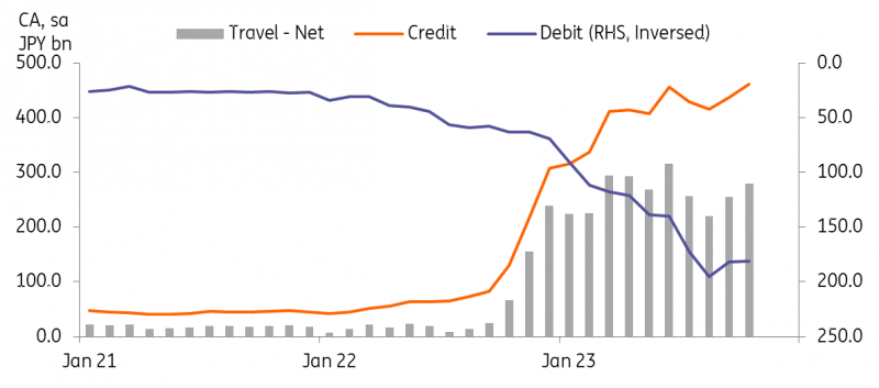 另一份报告显示,日本10月份经常账户盈余扩大幅度超出预期,达到2.6日元,9月份为2.0,市场共识为1.8。尽管面临全球逆风,未来几个月经常账户盈余可能会扩大。由于大宗商品价格下跌,商品账户将出现盈余,而外国游客的涌入将有助于旅游账户保持盈余。ING预计,本季商品和服务贸易将有所改善。