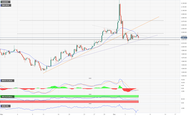 2023-12-08 15:29:38周五(12月8日)亚市尾盘,现货黄金短线小幅走低,金价刚刚跌破2030美元/盎司关口,几乎回吐日内反弹幅度。FXStreet分析师Matías Salord最新撰文,对黄金技术前景进行分析。