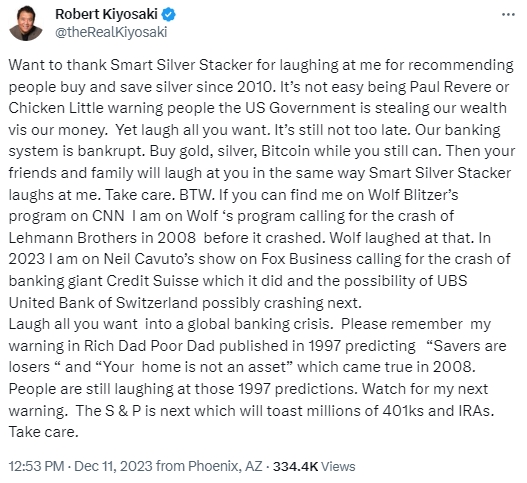 2023-12-13 08:39:52曾准确预测2008年金融风暴、2023年瑞士信贷崩溃的《富爸爸穷爸爸》作者罗伯特·清崎(Robert Kiyosaki)在周一(12月11日)向市场发布重大警告,称下一轮崩盘的是标准普尔500指数,并且此次将严重威胁退休基金。他呼吁投资者,应尽快买入黄金、白银。