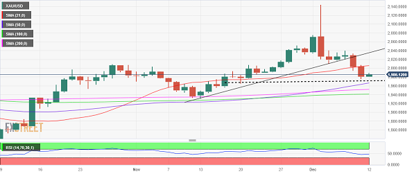 FXStreet分析师Dhwani Mehta指出,金价在周一触及三周低点1976美元/盎司后,正在“舔舐伤口”。