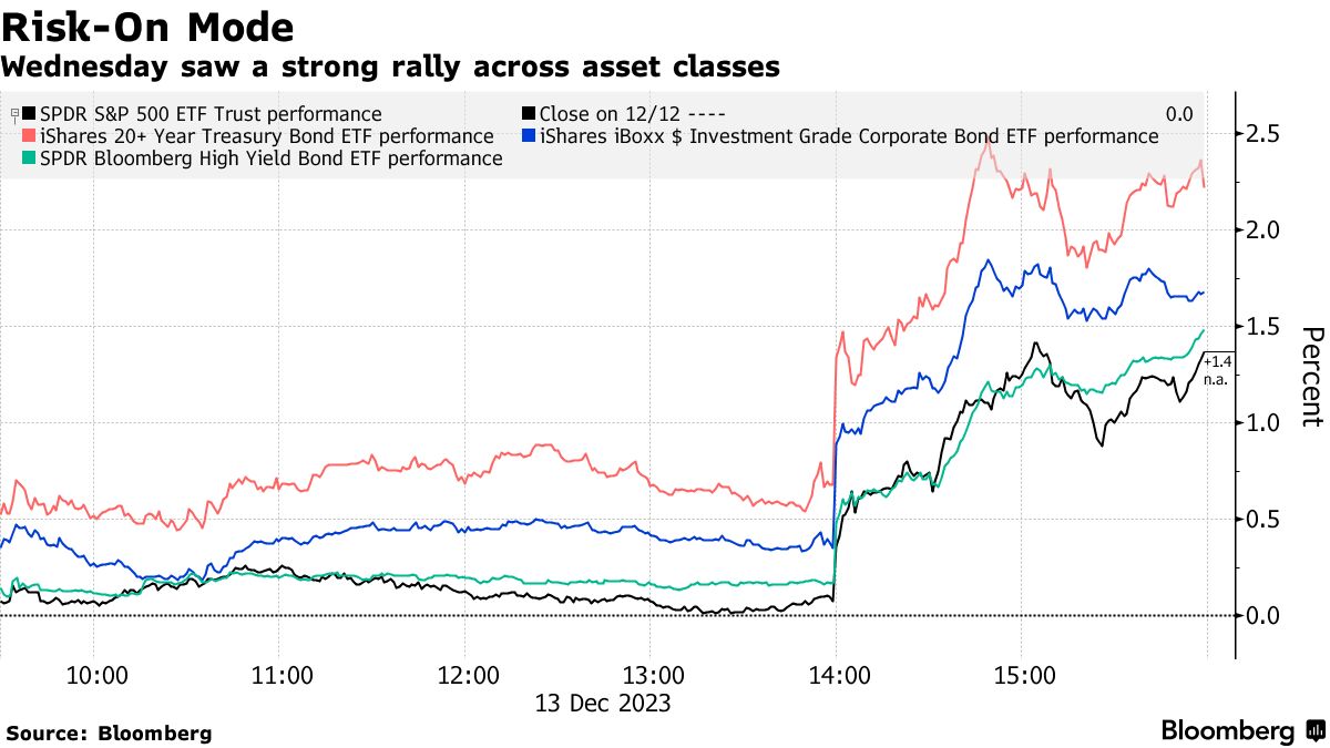 当然,不能保证周三的涨势会持续下去。过去两年,市场多次押注降息,但在美联储没有改变策略时却措手不及。官员们一致同意将基准联邦基金利率的目标区间维持在5.25%至5.5%,鲍威尔表示,如果通胀回升,官员们准备再次加息。