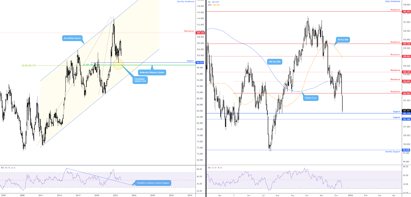 尽管每日时间框架接近潜在支撑区域,但每月时间框架表明,美元指数可能会进一步表现不佳,接近100.00水平,支撑位为99.67。