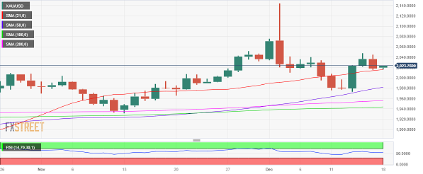 从黄金日线图来看,只要14日相对强弱指数(RSI)保持在中线上方,且金价设法守住21日简单移动平均线(SMA)2016美元/盎司,那么金价的技术面走势将继续有利于看涨交易员。