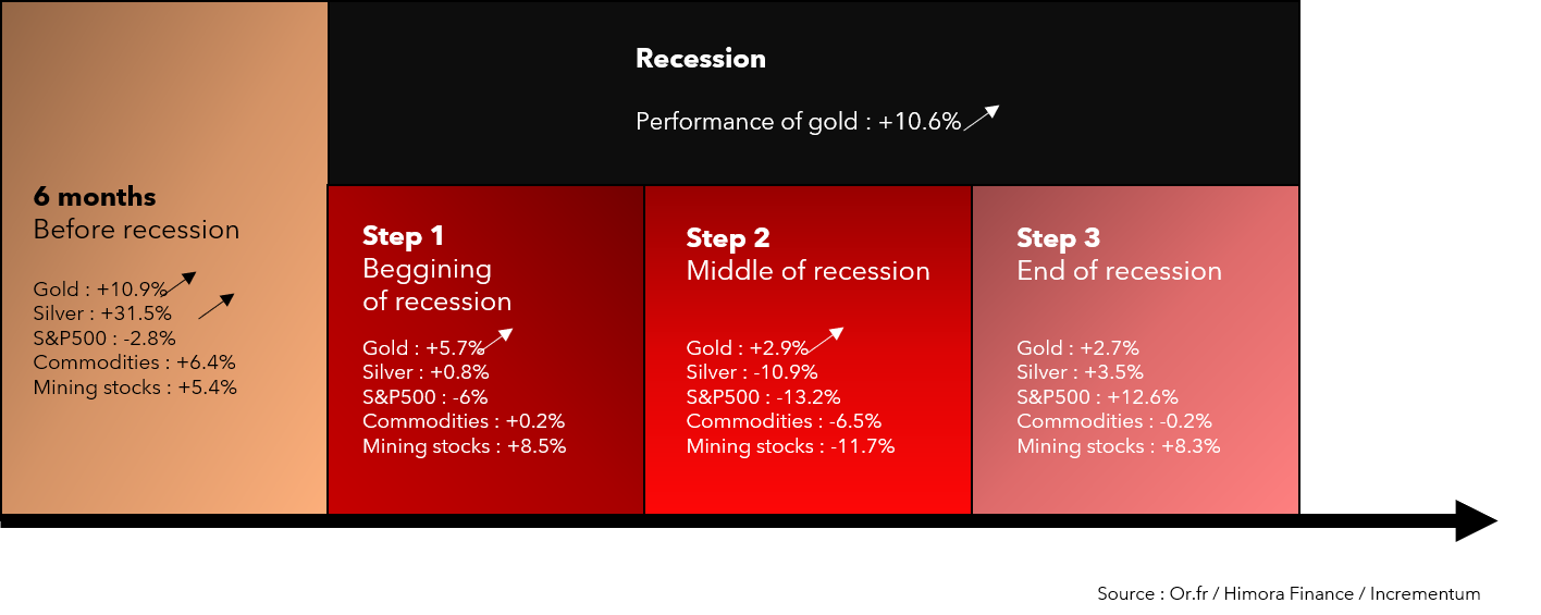 通过这些不同的利率变动,市场还观察到10年期债券收益率与金价之间存在正相关关系。 换句话说,利率下降对黄金特别有利。这一趋势将持续下去,因为市场预计从现在到2025年将多次降息。定价是有道理的,因为美联储目前没有必要加息,需要的是看到加息传导至实体经济,平均需要12至18个月。