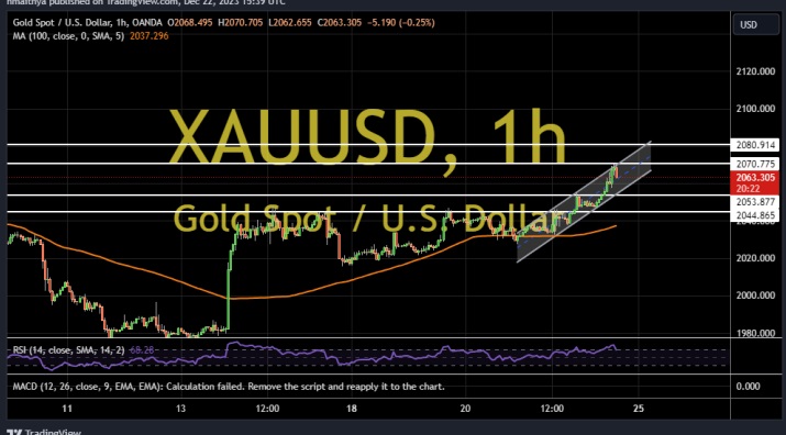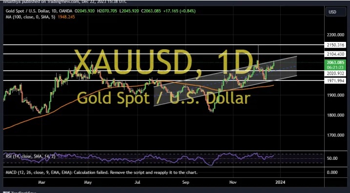 2023-12-25 13:15:05因美联储最青睐的通胀数据逊于预期,巩固市场对美联储在明年3月降息的预期,美元指数上周五(12月22日)触及近五个月低点,现货黄金价格一度升至2070美元/盎司上方的多周新高。知名财经网站FXDailyReport分析师Nicholas Kitonyi撰文,对黄金后市走势进行分析。