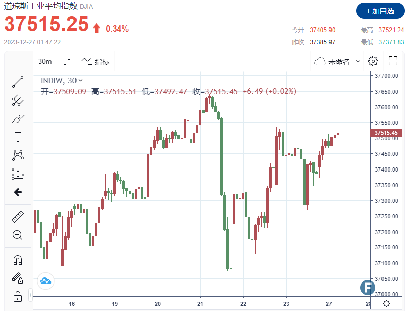 道指涨幅为0.34%,现报37515.25点;纳指涨幅为0.42%;标普500指数涨幅为0.36%,现报4772.38点。