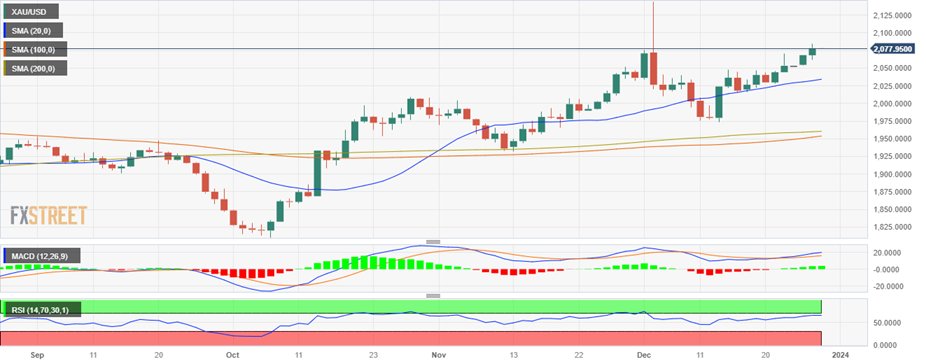 2023-12-28 10:40:34周四(12月28日)亚市盘中,现货黄金短线突然快速上升近10美元,金价最新位于2088美元/盎司附近,此前刷新近三周高点至2087.71美元/盎司。。FXStreet分析师Patricio Martín撰文,对金价技术前景进行分析。