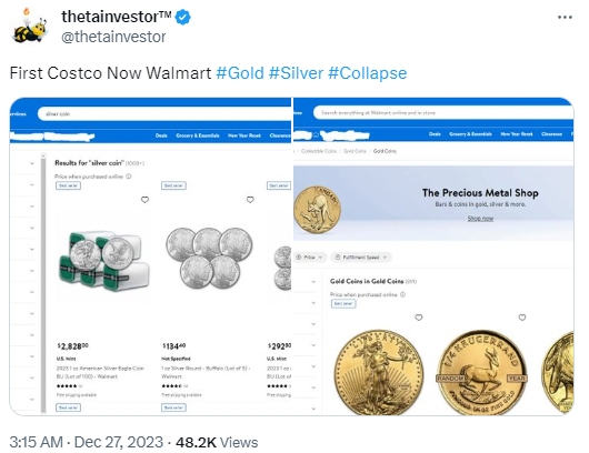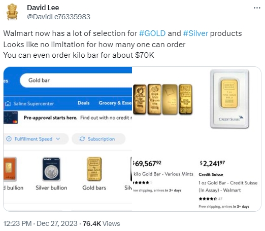 “沃尔玛现在有很多黄金和白银产品可供选择,看起来可以订购的数量没有限制,消费者甚至可以用大约7万美元的价格订购公斤条。”