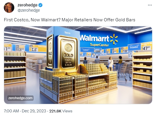 据知名金融博客ZeroHedge报道,沃尔玛是最新一家在其在线商店提供各种黄金产品的主要零售商。几个月前,会员制批发零售商开市客开始销售1盎司金条。