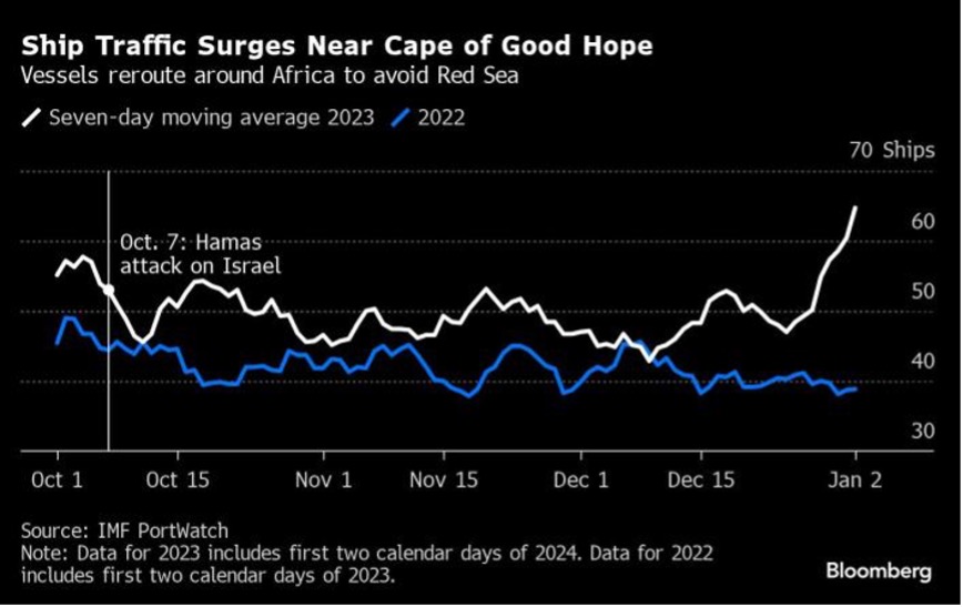 红海持续的紧张局势,迫使许多货船避开这一连接亚洲和欧洲的关键通道。也意味着为寻找远离也门被伊朗支持的胡塞武装分子导弹攻击的安全水域,需要额外绕行数百英里以及承担更高的成本。根据国际货币基金组织(IMF)PortWatch数据,自去年12月底以来,绕过非洲好望角的航运交通量激增。与此同时,在截至1月2日的10天里,苏伊士运河的过境量比上年同期下降了28%。