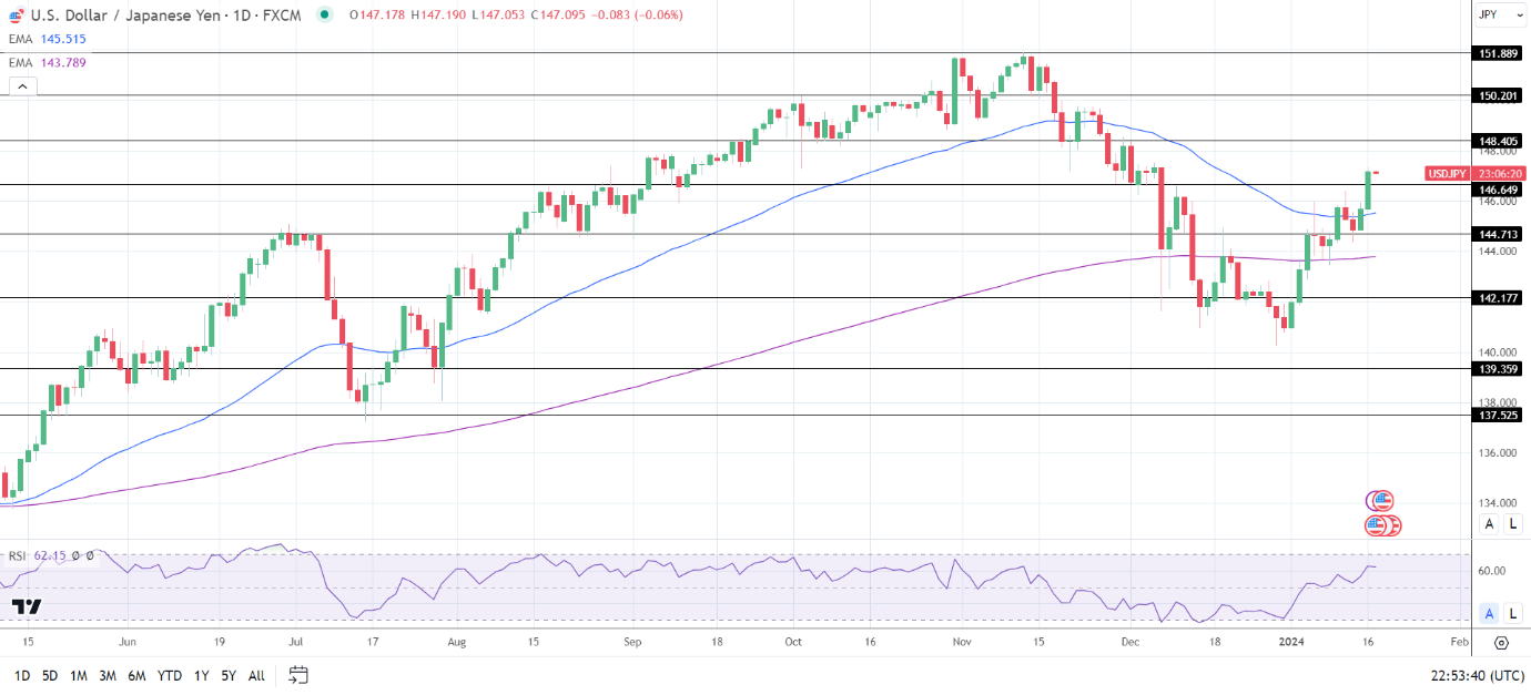 14天RSI为62.15,表明美元/日元在进入超买区域之前将升至148.405阻力位。