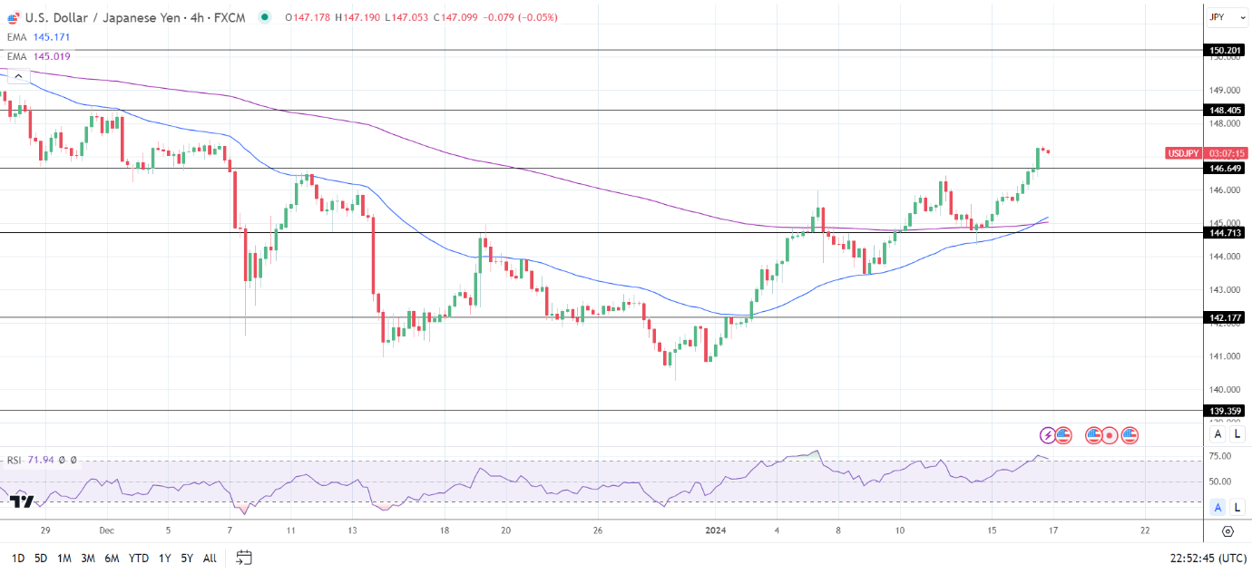 14周期4小时RSI为71.94,显示美元/日元处于超买区域,卖压可能会在147.500处加剧。