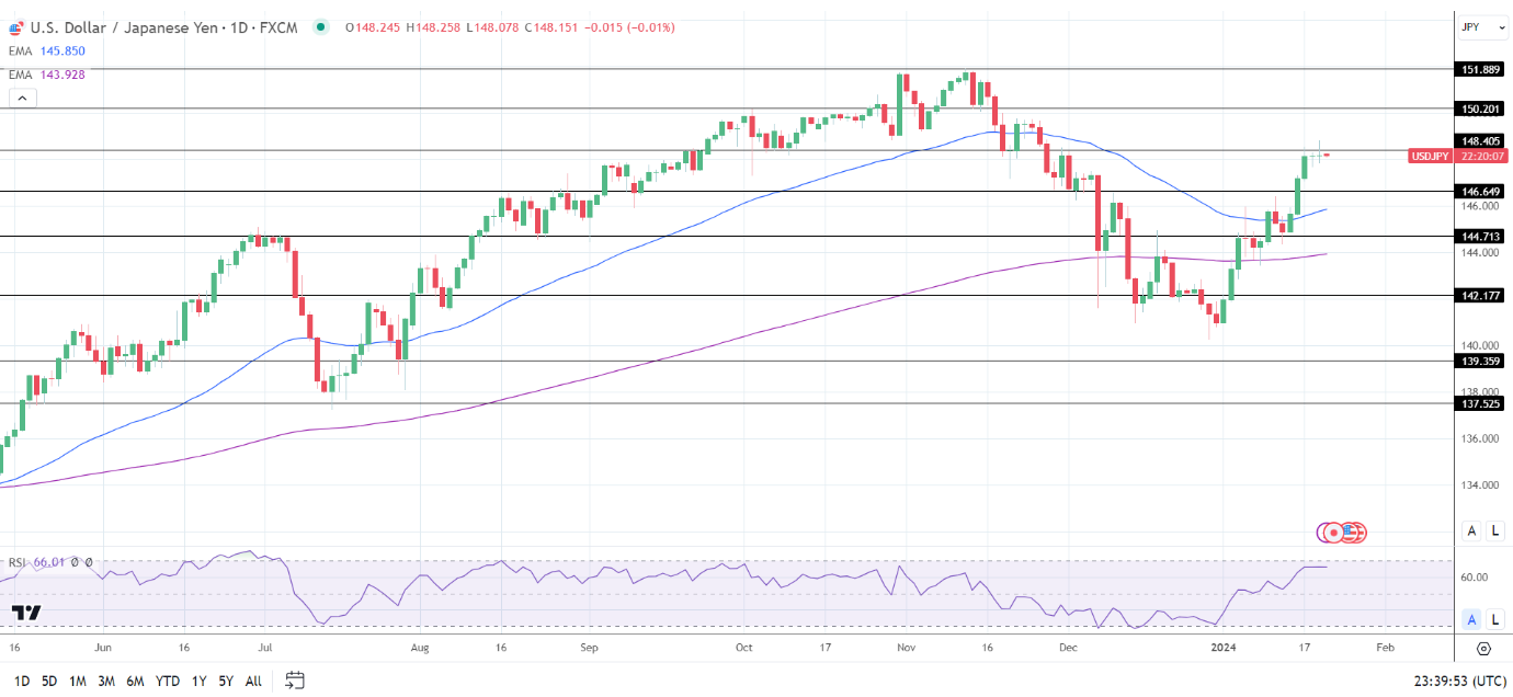 14天RSI为66.01,表明美元/日元在进入超买区域之前将回到149关口。