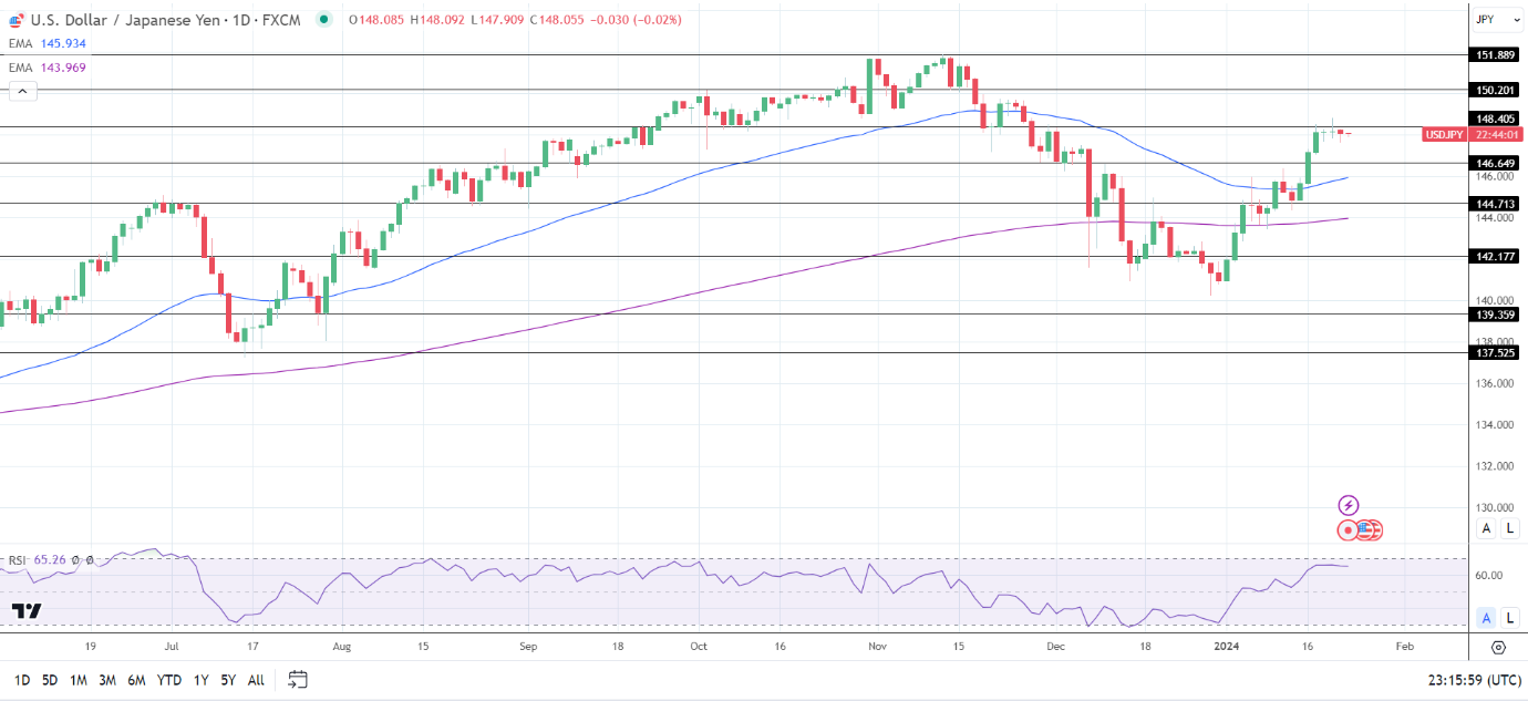 14天RSI为65.26,表明美元/日元在进入超买区域之前将回到149关口。