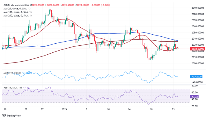 2024-01-24 12:15:26周三(1月24日)亚市盘中,现货黄金震荡微跌,目前交投于2024.30美元/盎司,跌幅约0.24%。FXStreet首席分析师Valeria Bednarik最新撰文,对黄金技术前景进行分析。