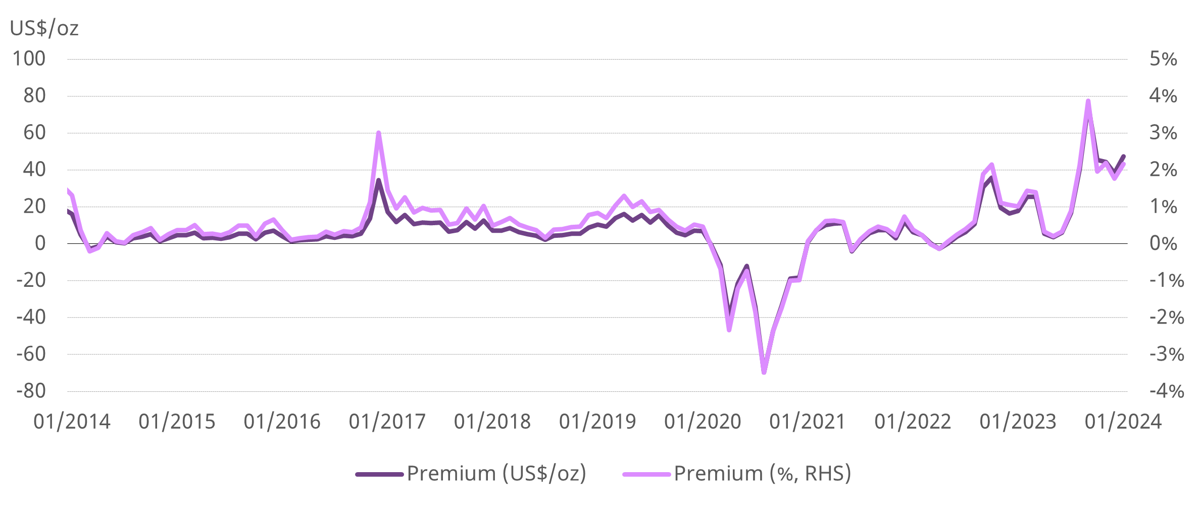 上月上海金交所黄金提现量总计 271 吨,较 2023 年工作日减少的低基数增长 95%,环比激增 65%。正如我们之前提到的,春节假期前后传统销售热潮之前的积极补货推动了 1 月份的批发黄金需求大幅上升。由于农历新年假期通常发生在 1 月底或 2 月初,一月份通常是黄金提现最强劲的月份。我们认为稳定的本地金价提供了额外的支撑。