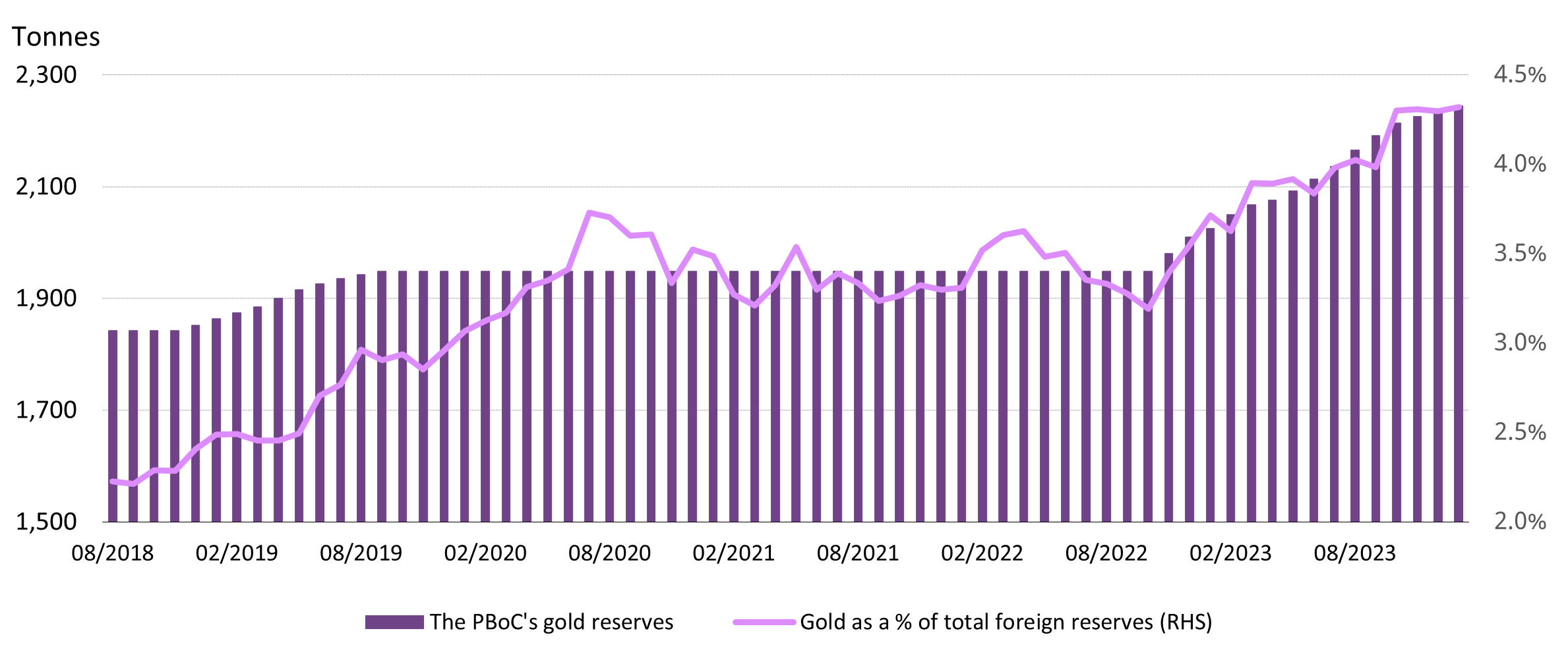 中国人民银行公布 1 月份连续第 15 次购买黄金,黄金储备增加 10 吨,总量达到 2,245 吨。