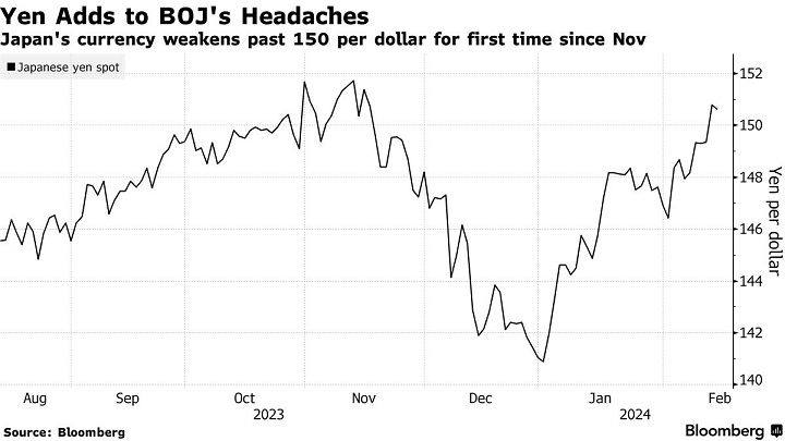 美元/日元周二(2月13日)飙升近1%,自去年11月以来首次突破150。当日美国公布的通胀数据超出预期,降低人们对美联储将提前降息的预期。