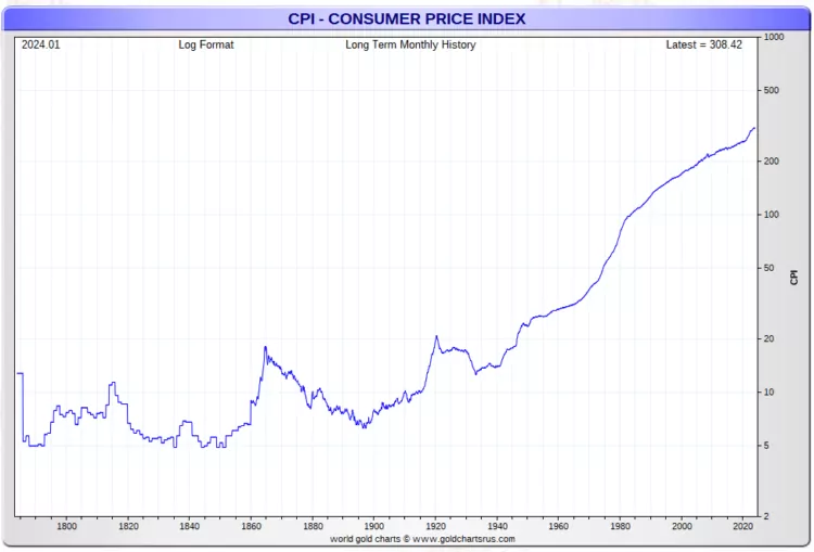 日志格式的历史CPI图表如下所示,请留意在黄金储备法出台之前,CPI是如何在特定范围内保持较低水平的。另外,需要关注自尼克松单方面决定将黄金与美元世界储备体系脱钩以来,CPI如何开始呈指数级上涨。