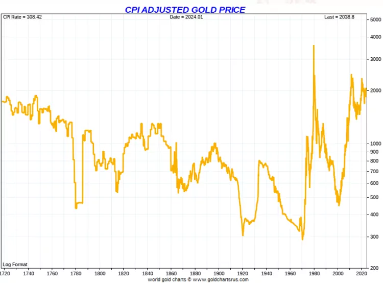 即使在200年的时间里,CPI调整后的黄金价格(黄线)也相当稳定,这再次表明黄金可以保持购买力。