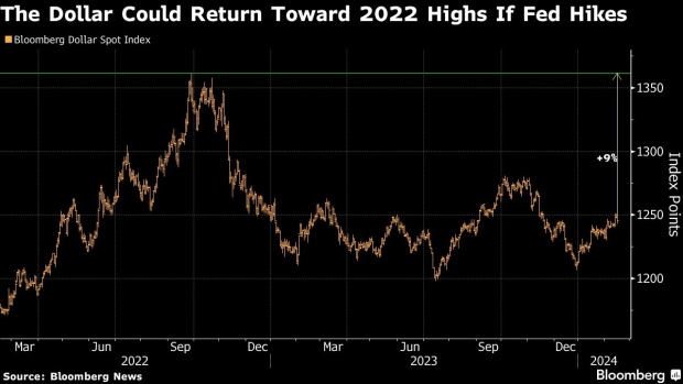 法国兴业银行首席外汇策略师Kit Juckes上周在一份报告中告诉客户,如果“美国经济重新加速,美联储最终将不得不再次收紧货币政策,美元将会反弹”,可能回到2022年的历史高点。