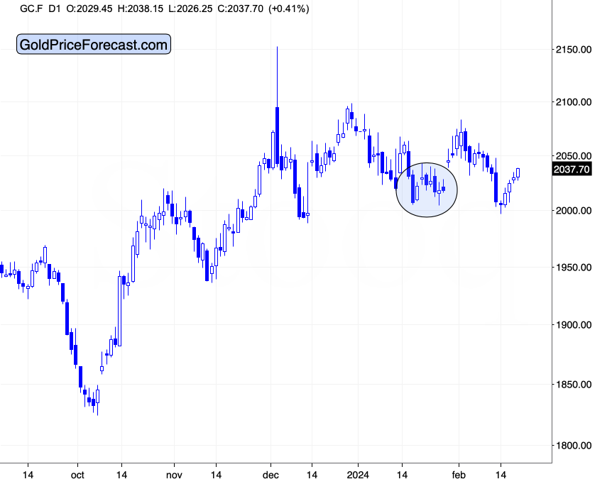 2024-02-21 14:16:45贵金属分析师、Sunshine Profits创始人兼主编Przemyslaw Radomski指出,从上周五到周三(2月21日)行情来看,黄金价格大幅反弹至2030美元,已重返美国消费者物价指数(CPI)发布前的水平。但他强调,美元指数长期走低的拐点未形成,因此仍阻碍黄金看涨趋势。