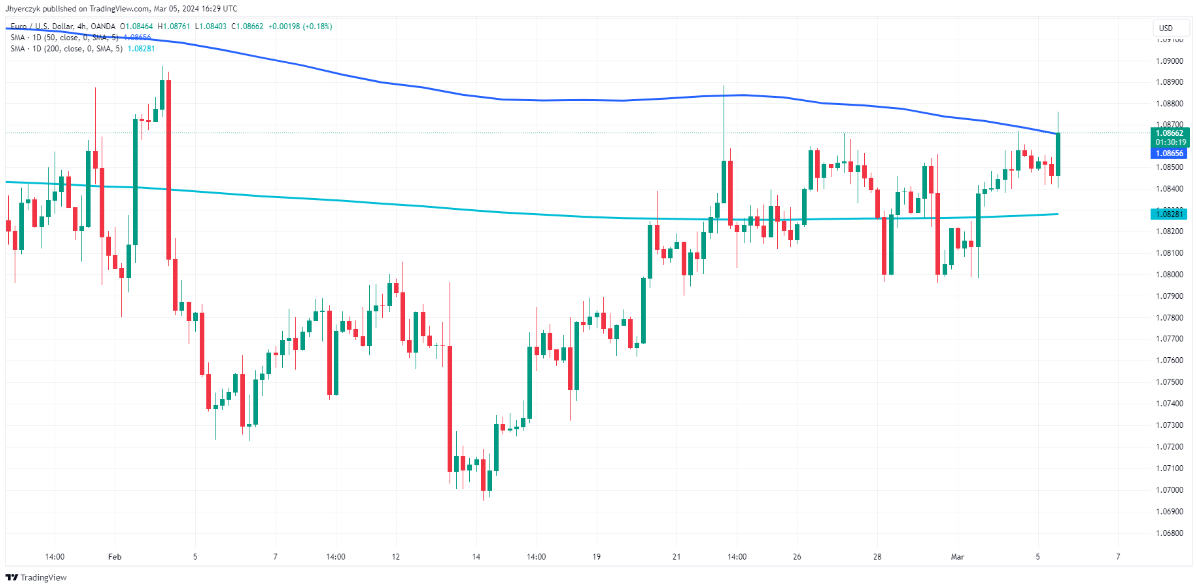 欧元/美元在突破之前的多个高点并超越50日移动均线1.0866后,周二呈走高趋势。持续突破该水平可能会推动单一货币进入2月2日的主要顶部1.0898。长期支撑位是200日移动均线1.0828。