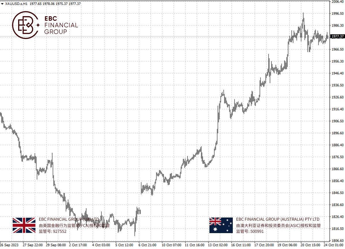 2023-10-24 00:00:00 周二(10月24日)黄金周二走高,基准美国国债收益率从5%上方回撤。在哈以冲突影响下,黄金过去2周大涨。