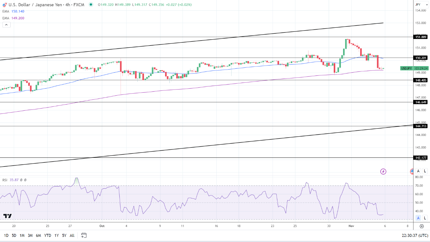 14周期4小时RSI为35.87,表明美元/日元在进入超卖区域之前跌破200日均线。
