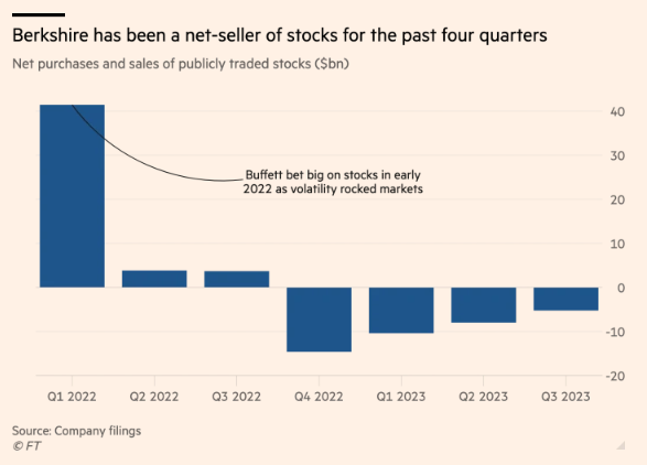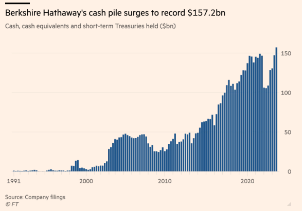 2023-11-06 08:12:34伯克希尔哈撒韦公司(Berkshire Hathaway)的现金储备飙升至创纪录的1570亿美元,期间首席执行官沃伦·巴菲特(Warren Buffett)继续出售在上市公司的股份,因为这位所谓的“奥马哈先知”(Oracle of Omaha)发现缺乏有吸引力的投资。