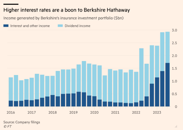 伯克希尔一直是美国利率上升的最大受益者之一,美国利率今年已攀升至5%以上。这位“奥马哈先知”一直在利用债券收益率飙升的机会,买入收益率至少为5%的短期美国国债。截至第三季度末,该集团拥有价值1264亿美元的此类投资,而去年年底约为930亿美元。