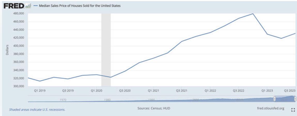房价在疫情期间飙升,并在短暂的下跌后继续小幅走高。今天的房屋销售价格中位数约为431,000美元。这比2019年第三季度高出35%,当时在美国出售的房屋中位数价格为318,400美元。