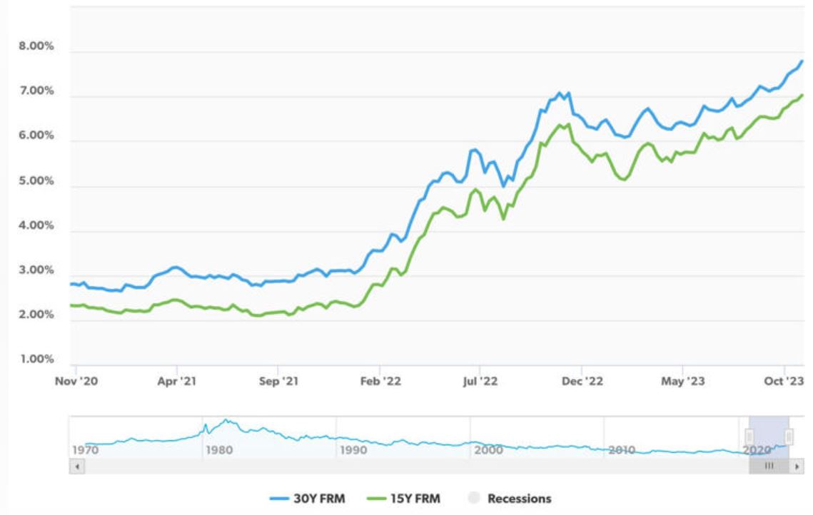 抵押贷款利率飙升并保持在接近8%的水平,这是二十多年来的最高水平。这让许多潜在的购房者处于观望状态,同时阻止潜在卖家列出他们的房屋,以避免放弃他们多年前锁定的较低利率。