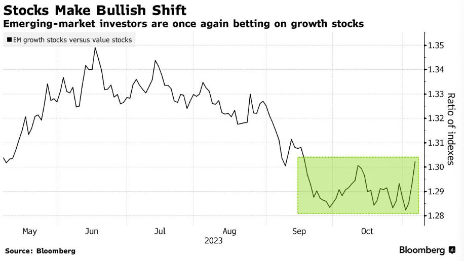 2023-11-07 07:20:08周一(11月6日),新兴市场股票投资者正在发出信号,表明他们不再寻求安全避险,而是渴望承担更多风险。