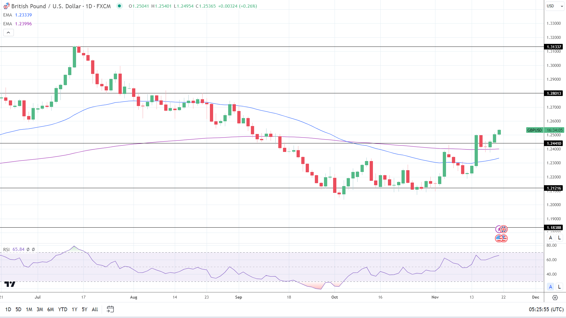 英镑/美元周一(11月20日)上升 0.41%,收于 1.25041 美元。贝利继续驳回降息谈判,支撑了英镑的买家需求。